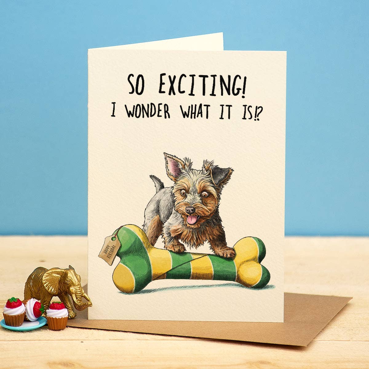 Greetings card, "What Is It Dog". The suspense is killing him. This card features one delightfully daft dog, gazing at a “mysteriously” wrapped gift. Perfect for anyone who appreciates a gift with zero surprises and maximum enthusiasm. The card is blank inside, so the card could be used for any occasion.
